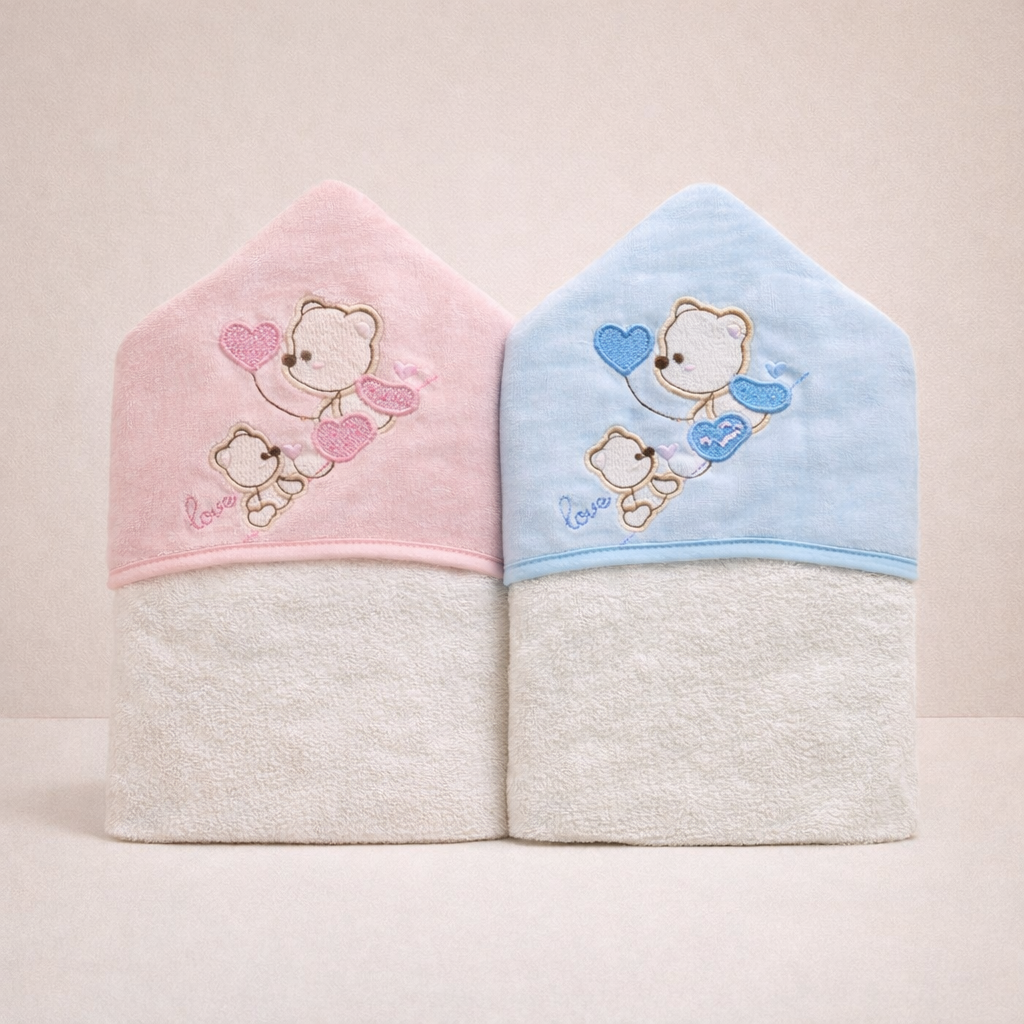 Avvolgi il tuo piccolo in un morbido abbraccio dopo il bagnetto con il nostro accappatoio triangolo per neonato, disponibile nelle varianti azzurro e rosa. Realizzato in soffice spugna assorbente all’interno e cotone delicato all’esterno, è progettato per offrire comfort, calore e protezione alla pelle sensibile dei neonati.