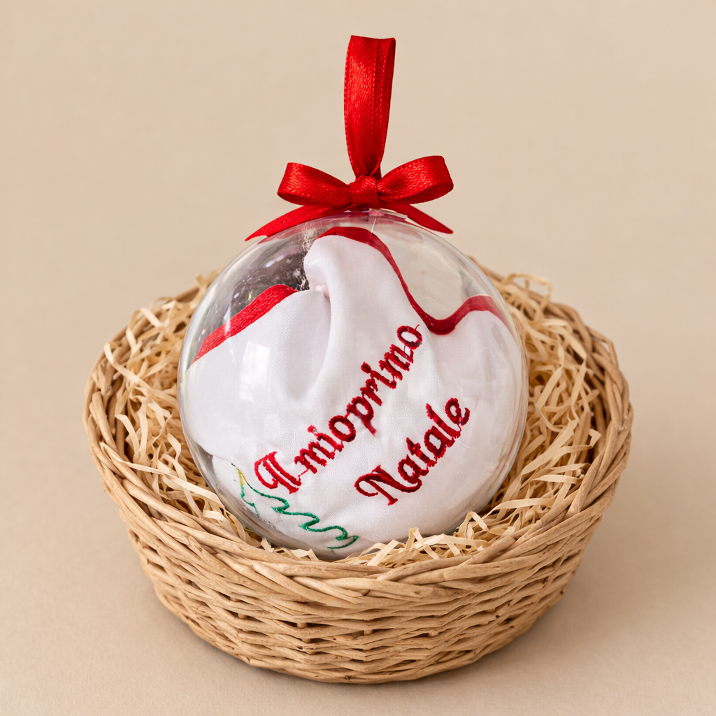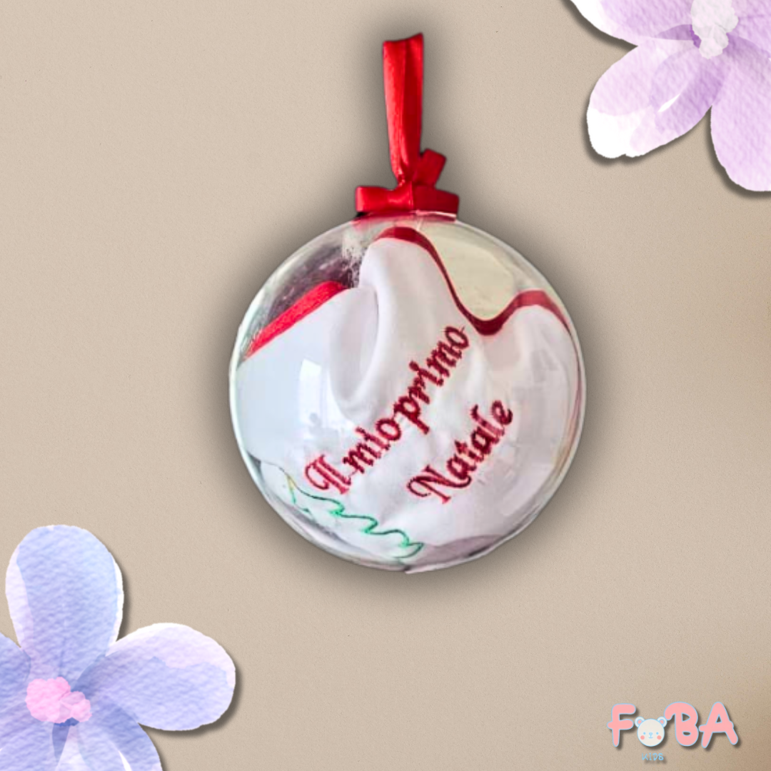 Rendi il periodo delle feste ancora più magico con la nostra confezione palla natalizia, che racchiude una dolcissima bavetta “Il mio primo Natale”.