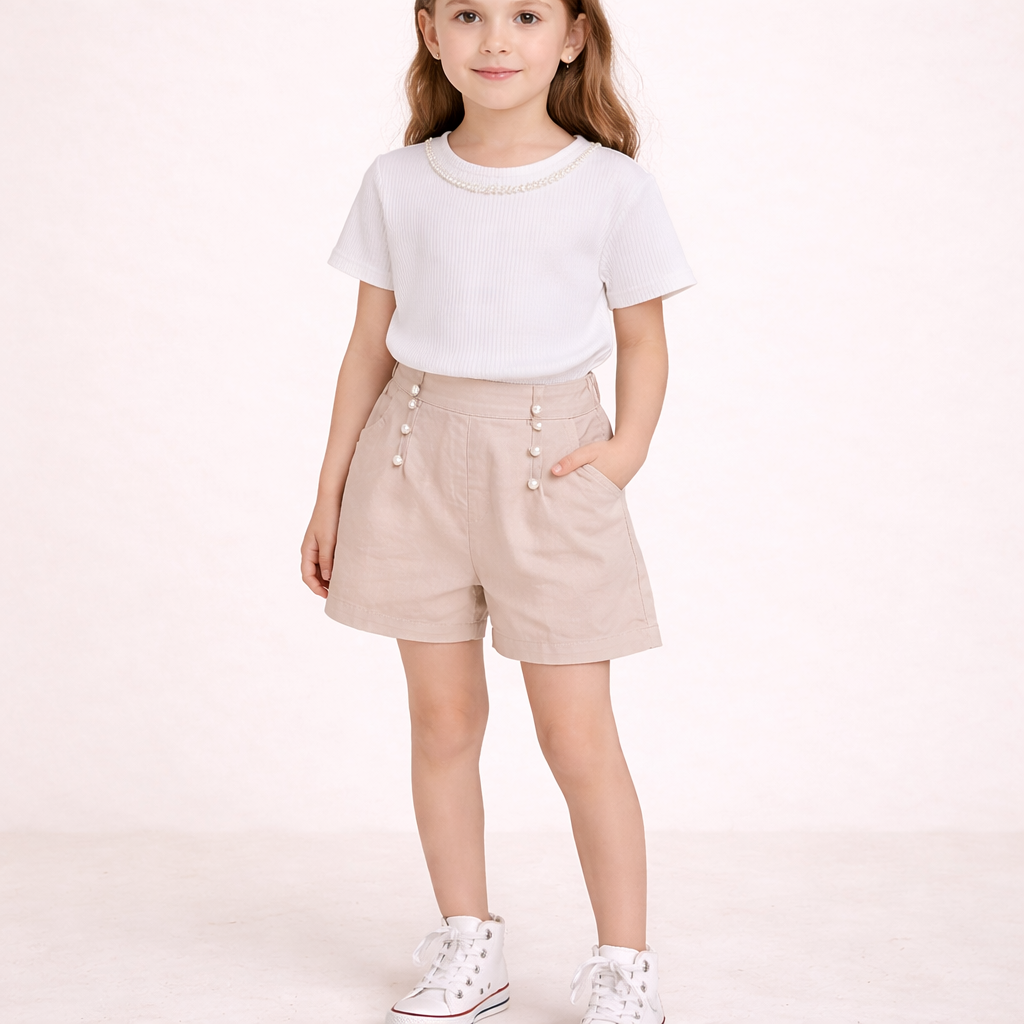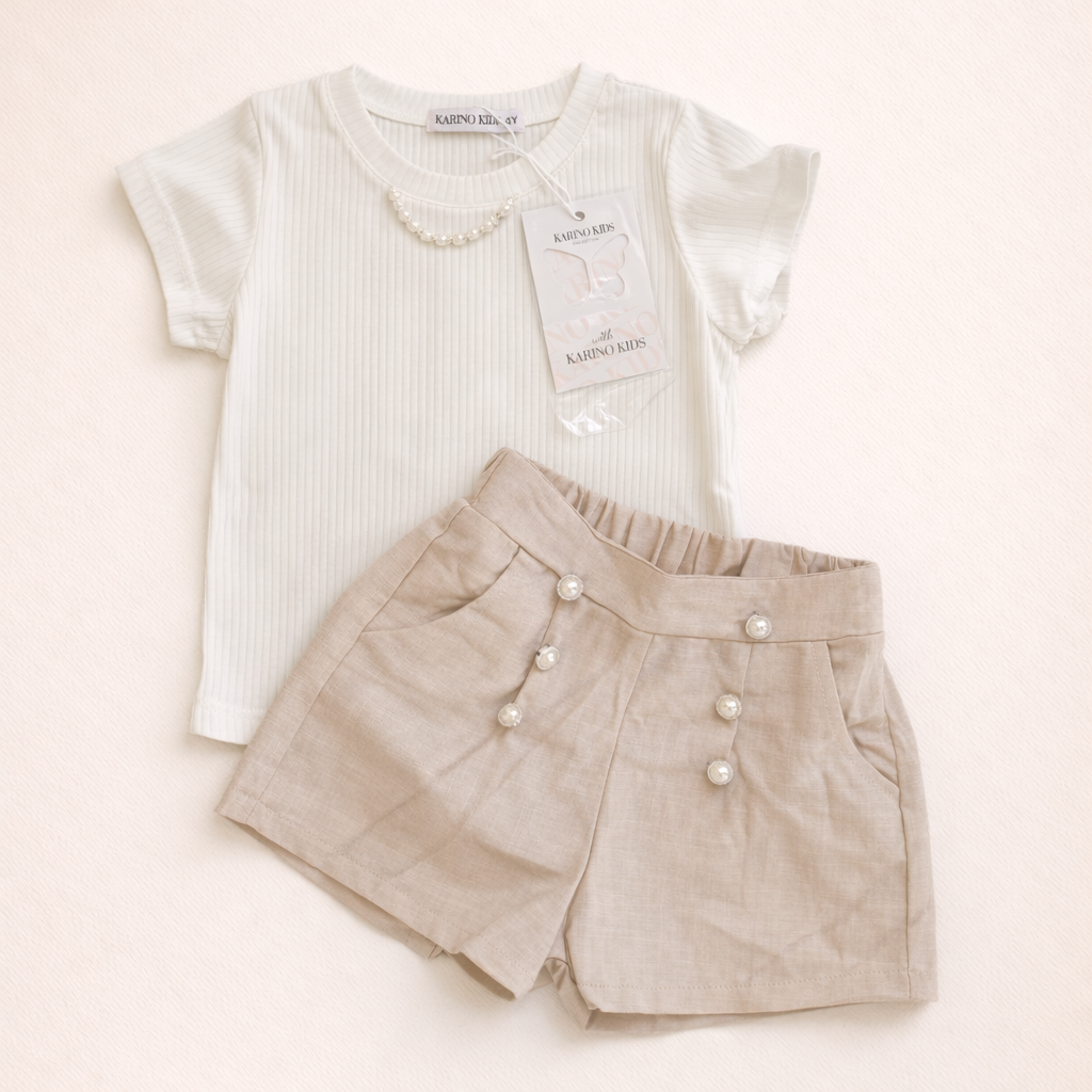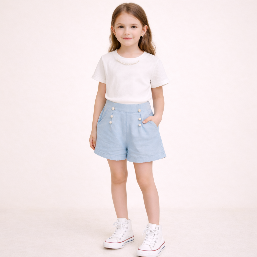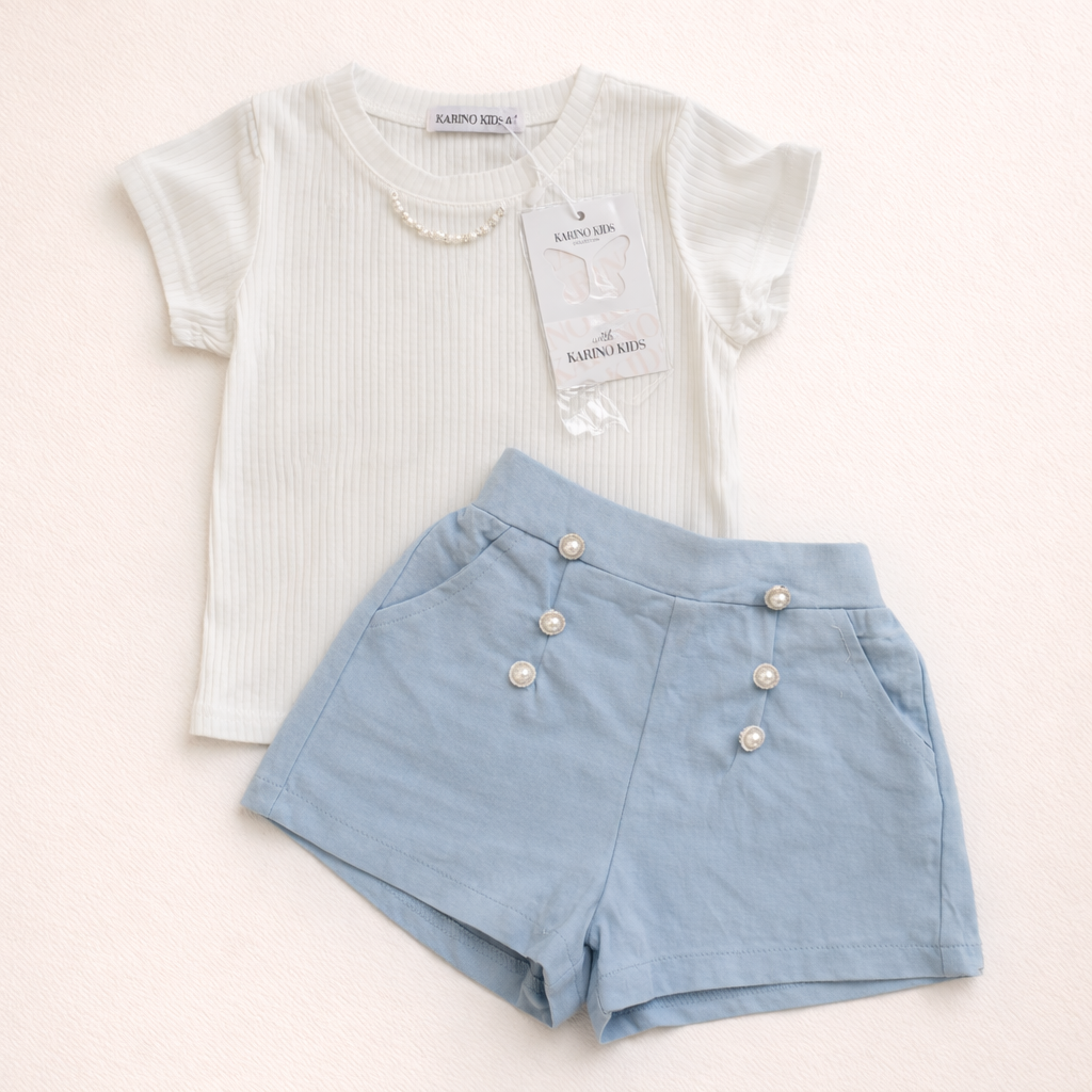 Scopri il meraviglioso completo due pezzi per bimba, pensato per un look elegante e alla moda. Questo set è composto da una t-shirt a manica corta e pantaloncino, perfetto per le giornate estive.