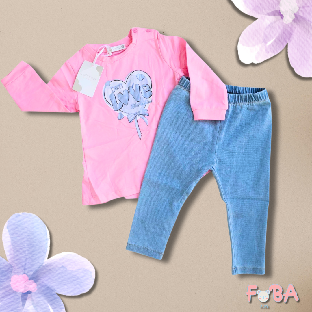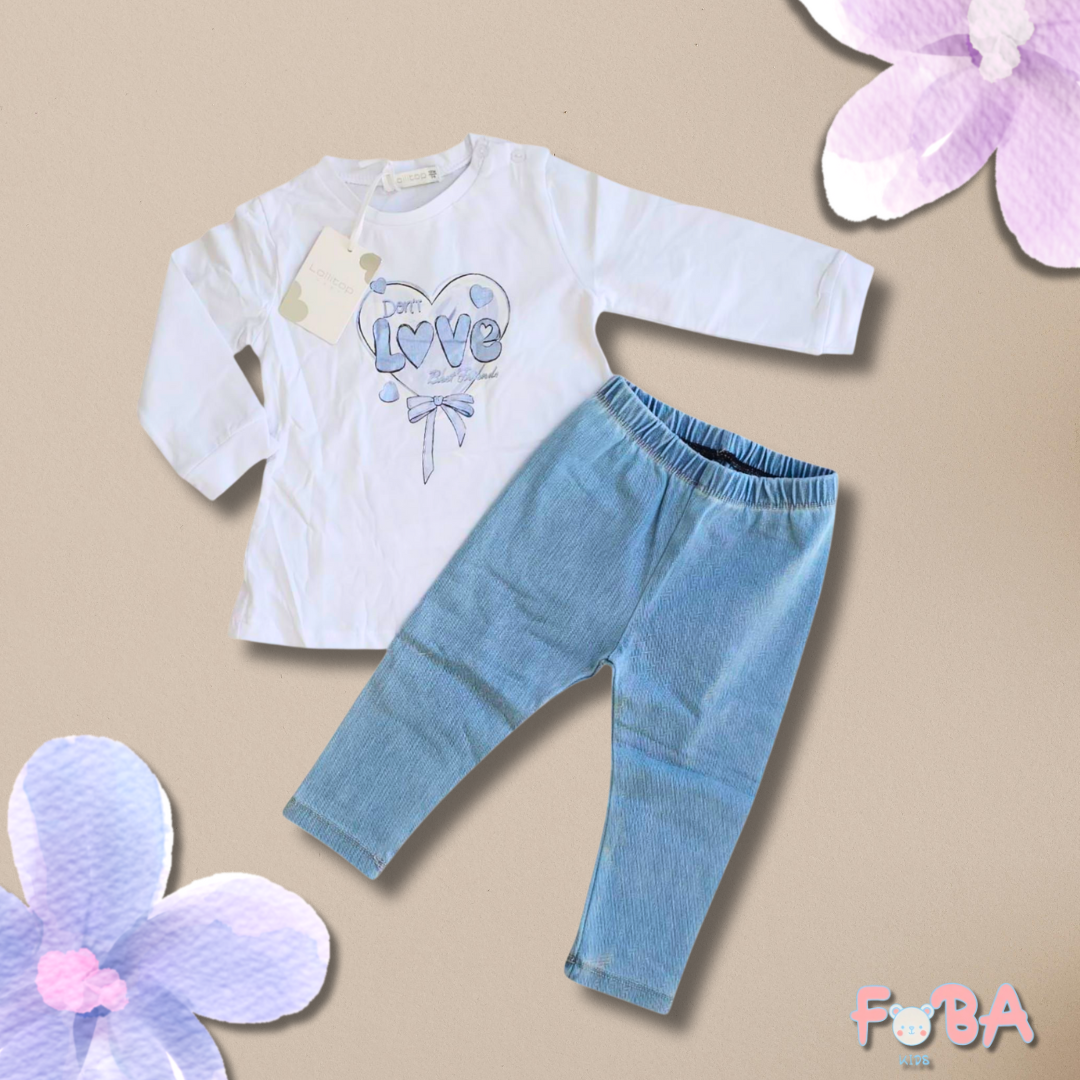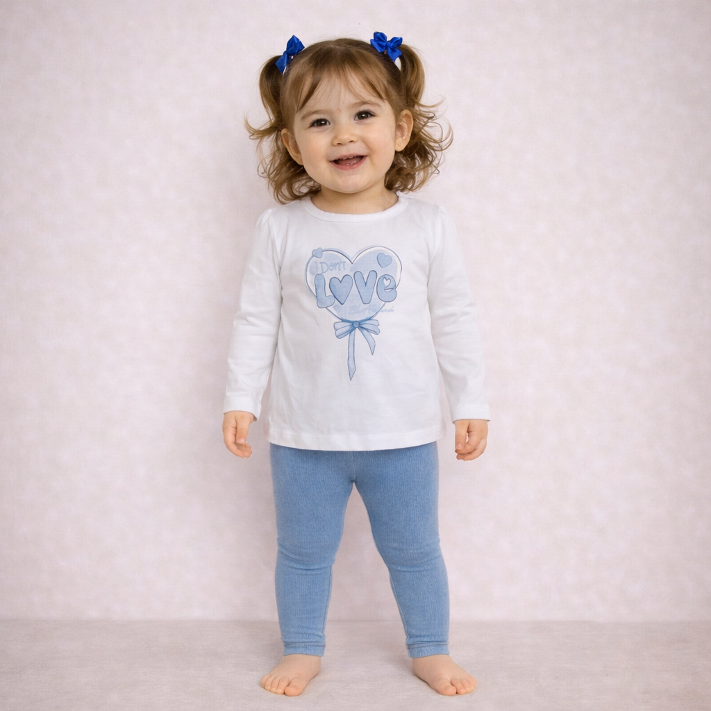 Il set include una t-shirt a manica lunga con stampa centrale allegra e vivace, resa ancora più speciale dalle ruches sul retro, che aggiungono un tocco femminile e ricercato.