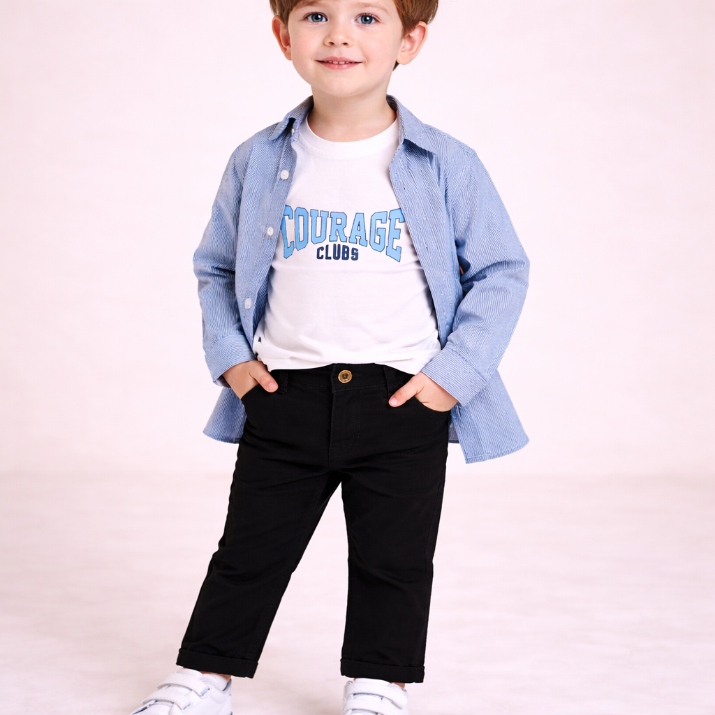 La camicia è realizzata al 100% in cotone, offrendo una sensazione di morbidezza sulla pelle del tuo bambino. La t-shirt, composta per il 95% da cotone e il 5% da elastan, assicura una vestibilità comoda e una libertà di movimento. Infine, i pantaloni, con una composizione di 97% cotone e 3% elastan, completano il look con un tocco di elasticità e praticità.