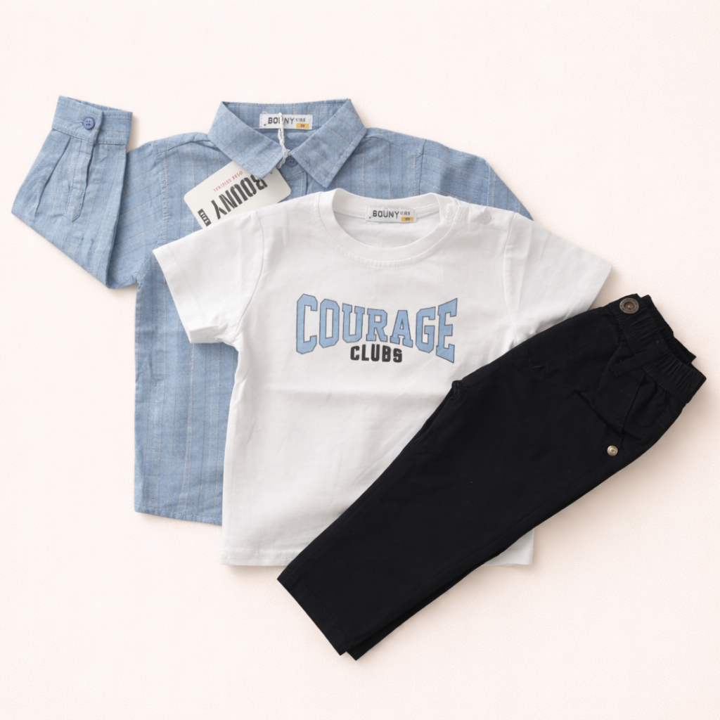 Presentiamo il set completo 3 pezzi per neonato, perfetto per ogni occasione, dalle celebrazioni ai momenti quotidiani. Questo outfit è composto da una camicia elegante, una t-shirt a maniche corte casual e pantaloni coordinati, tutti pensati per garantire comodità e stile.