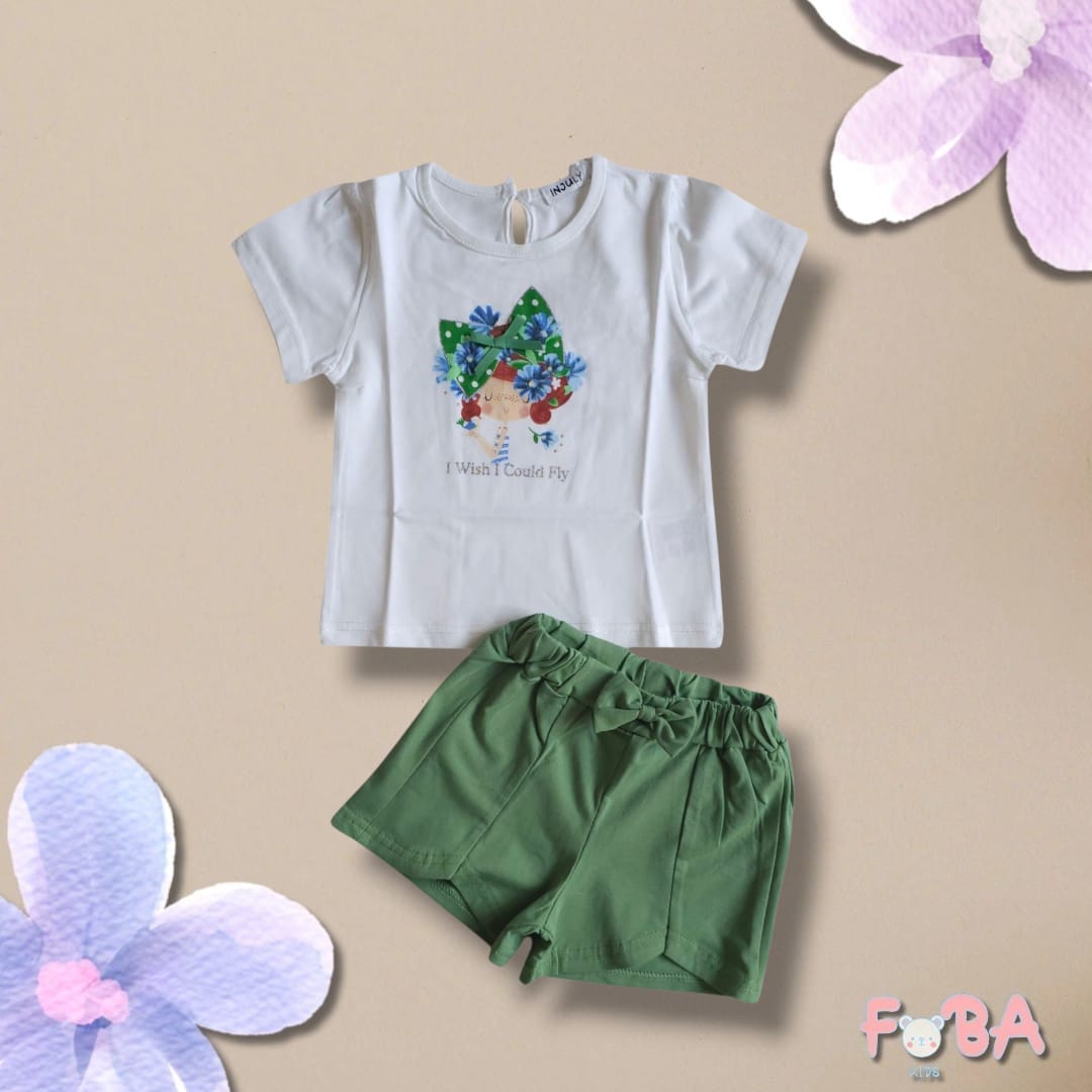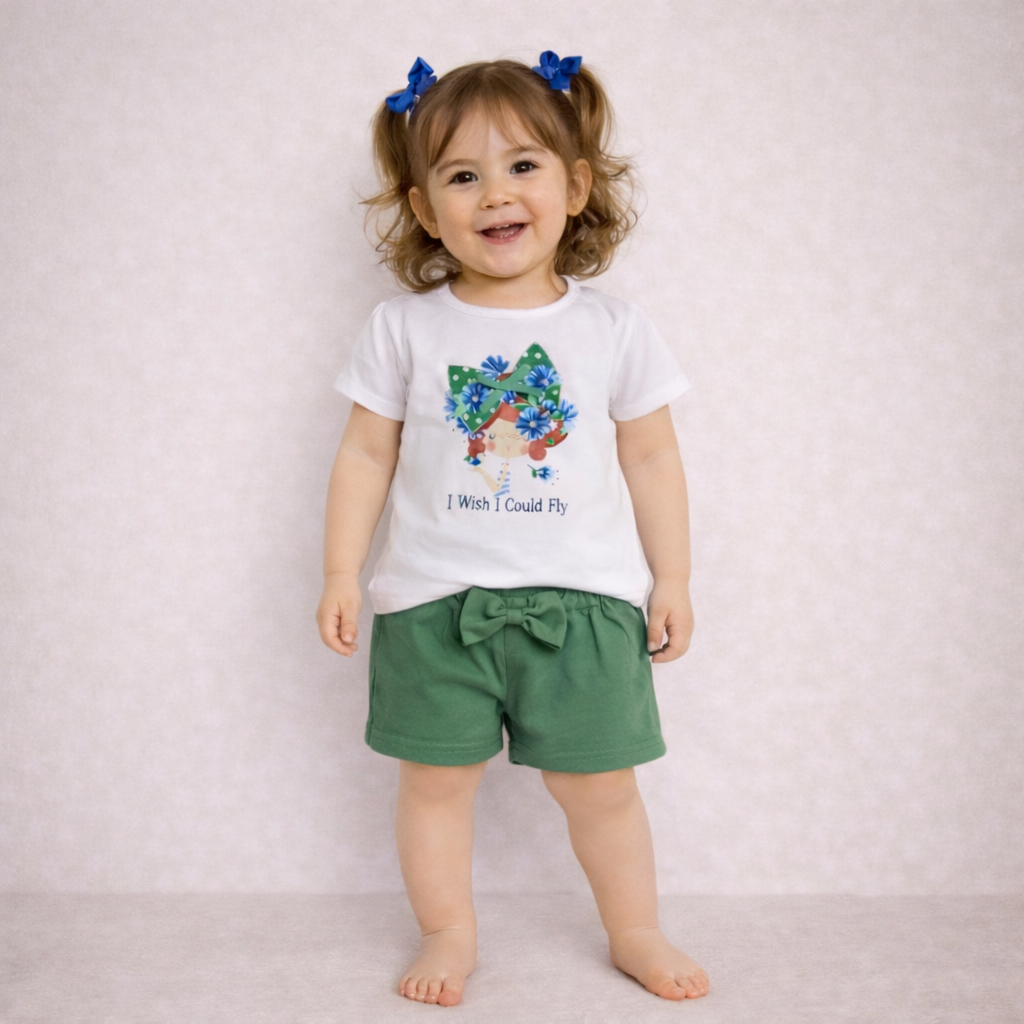 Questo delizioso completo estivo per bambina è ideale per le giornate calde e spensierate. La t-shirt bianca a maniche corte presenta una graziosa stampa centrale che dona un tocco di allegria e freschezza. Un fiocchetto verde in rilievo impreziosisce il capo, aggiungendo un dettaglio femminile e delicato. Abbinata alla maglietta c’è una comoda pantaloncino verde con elastico in vita, decorato anch’esso da un fiocco centrale che garantisce comfort e stile. La composizione del completo è composta dal 95% di cotone e dal 5% di elastan, assicurando morbidezza, traspirabilità e una vestibilità perfetta per le bambine. Un outfit pratico, carino e perfetto per accompagnare le piccole in tutte le loro avventure estive.