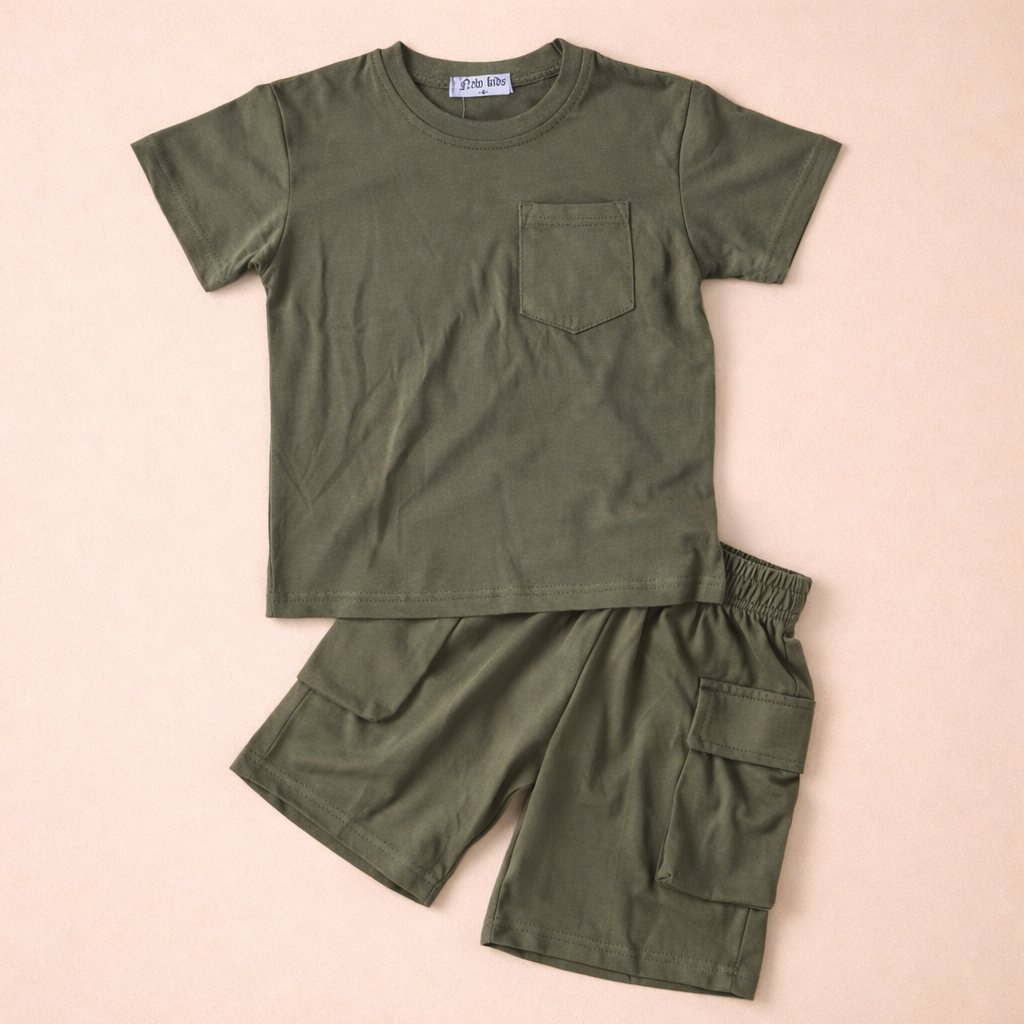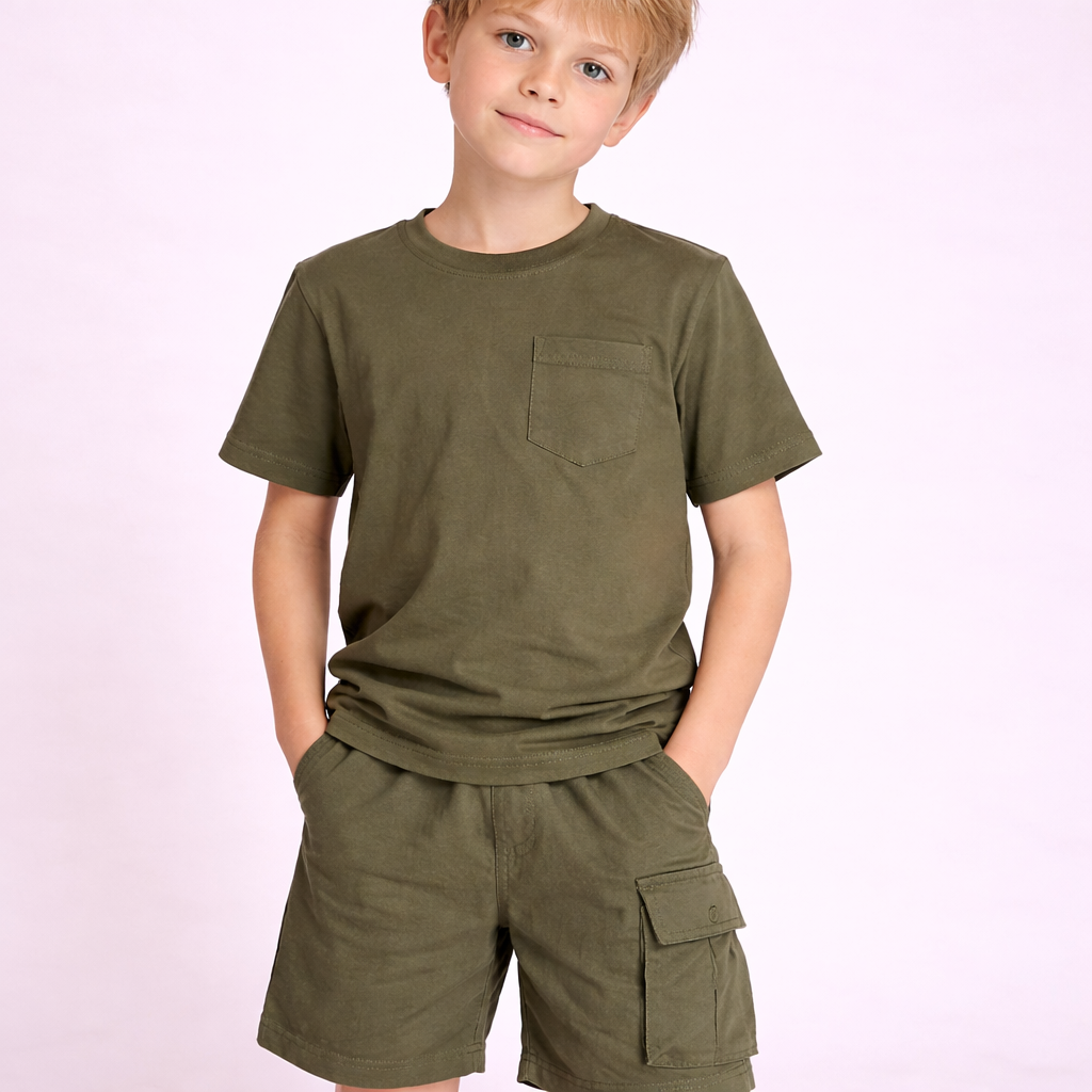 Il completo per bambino è composto da una comoda t-shirt tinta unita di colore verde militare, dotata di un pratico taschino sul petto. Abbinato, un pantaloncino con elastico in vita e due spaziosi tasconi laterali, ideale per il massimo comfort e funzionalità . La composizione è di 85% cotone e 15% poliestere, garantendo morbidezza, resistenza e facilità di manutenzione. Perfetto per un look casual e pratico, adatto alle giornate di gioco e relax.