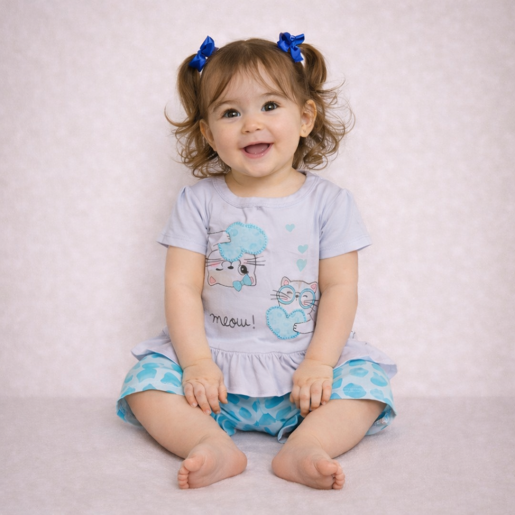 Questo completo adorabile e confortevole è composto da due pezzi perfetti per i più piccoli. La t-shirt bianca a maniche corte presenta un delicato dettaglio di ruches, decorata con una simpatica stampa di due graziosi gattini con cuori ricamati di colore turchese, aggiungendo un tocco dolce e vivace. Abbinato, un pantaloncino ciclista di colore turchese con stampe divertenti e un elastico in vita per una vestibilità comoda e pratica. Disponibile nelle taglie da 3 a 18 mesi, questo completo è ideale per le giornate estive.