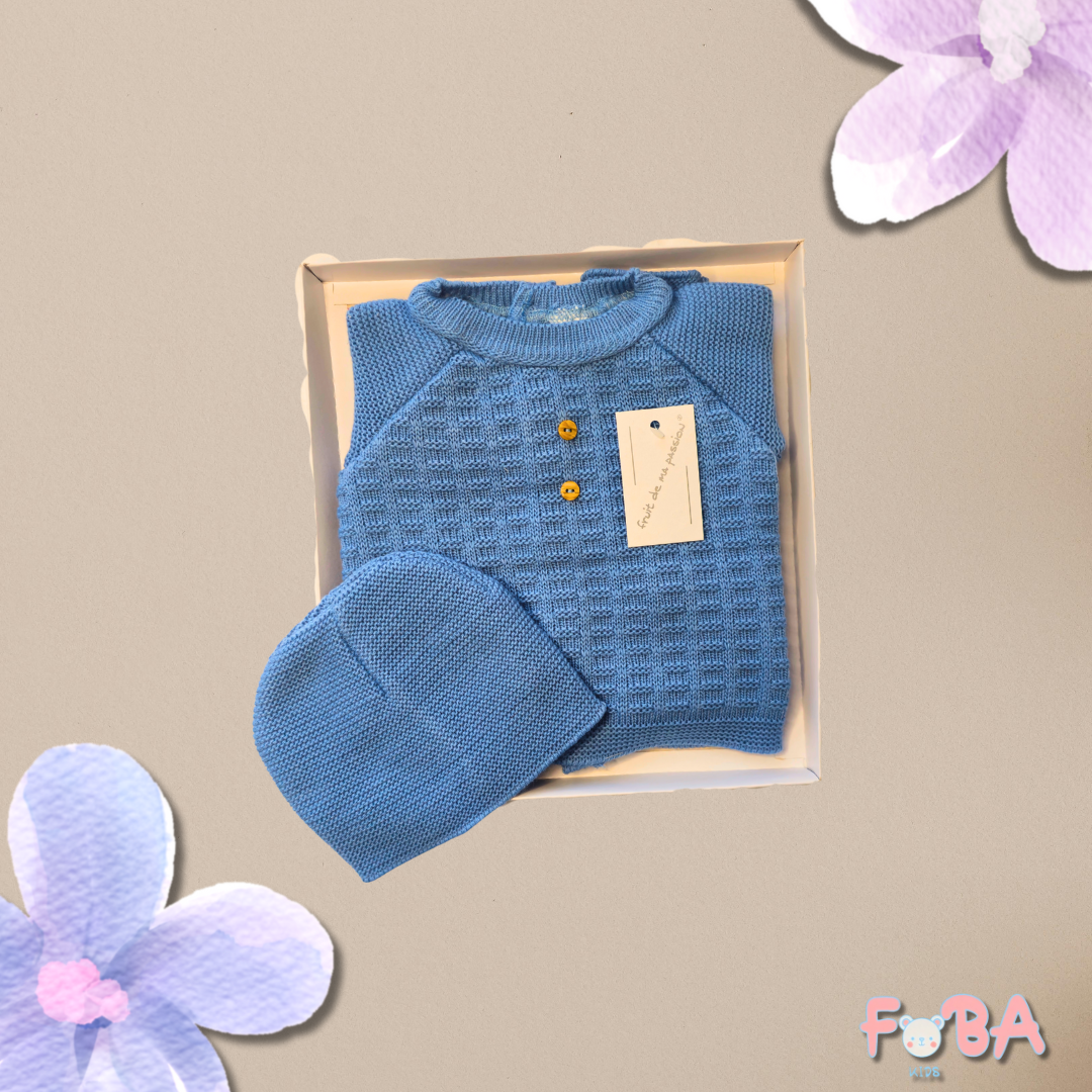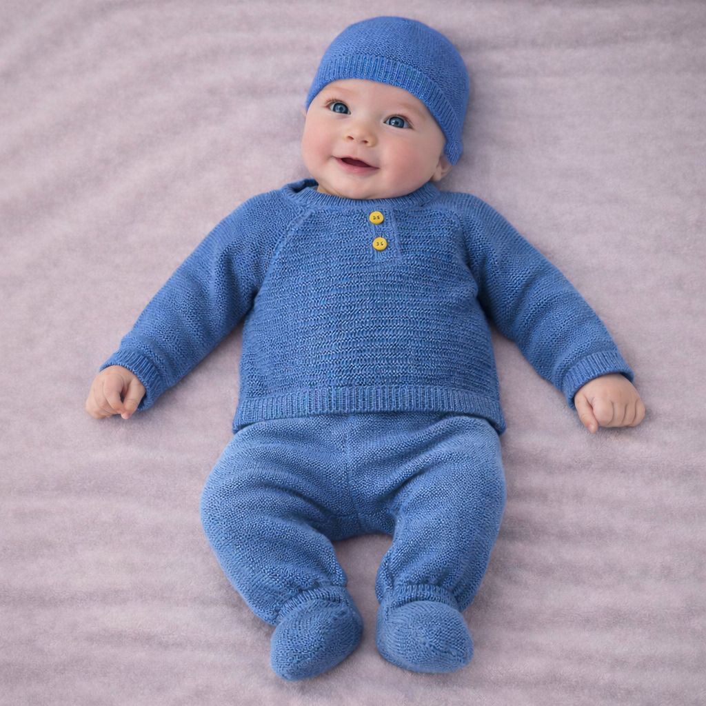 Elegante, morbido e perfetto per i primi mesi: il nostro completo neonato in maglia 3 pezzi versione maschietto è pensato per accompagnare il tuo bimbo nei momenti più dolci della sua crescita.