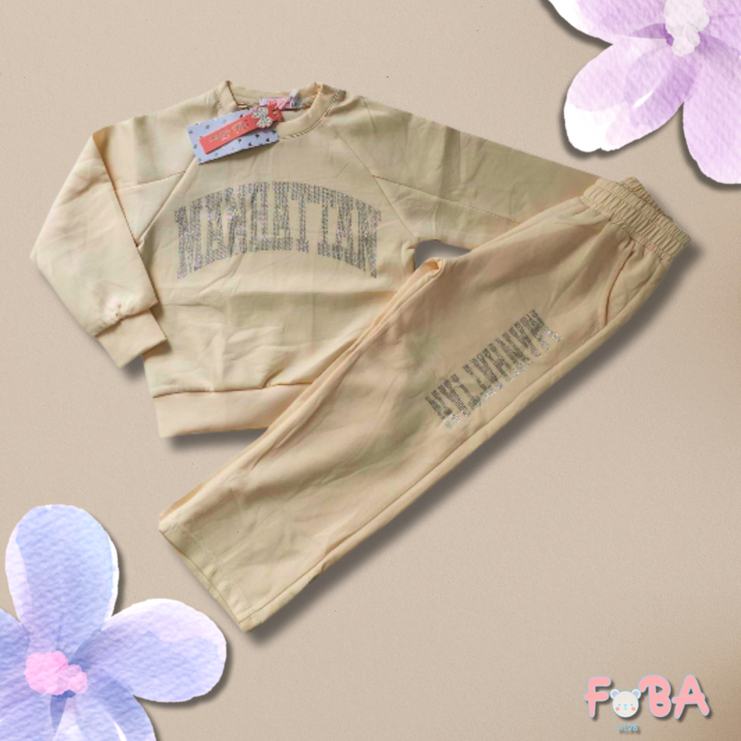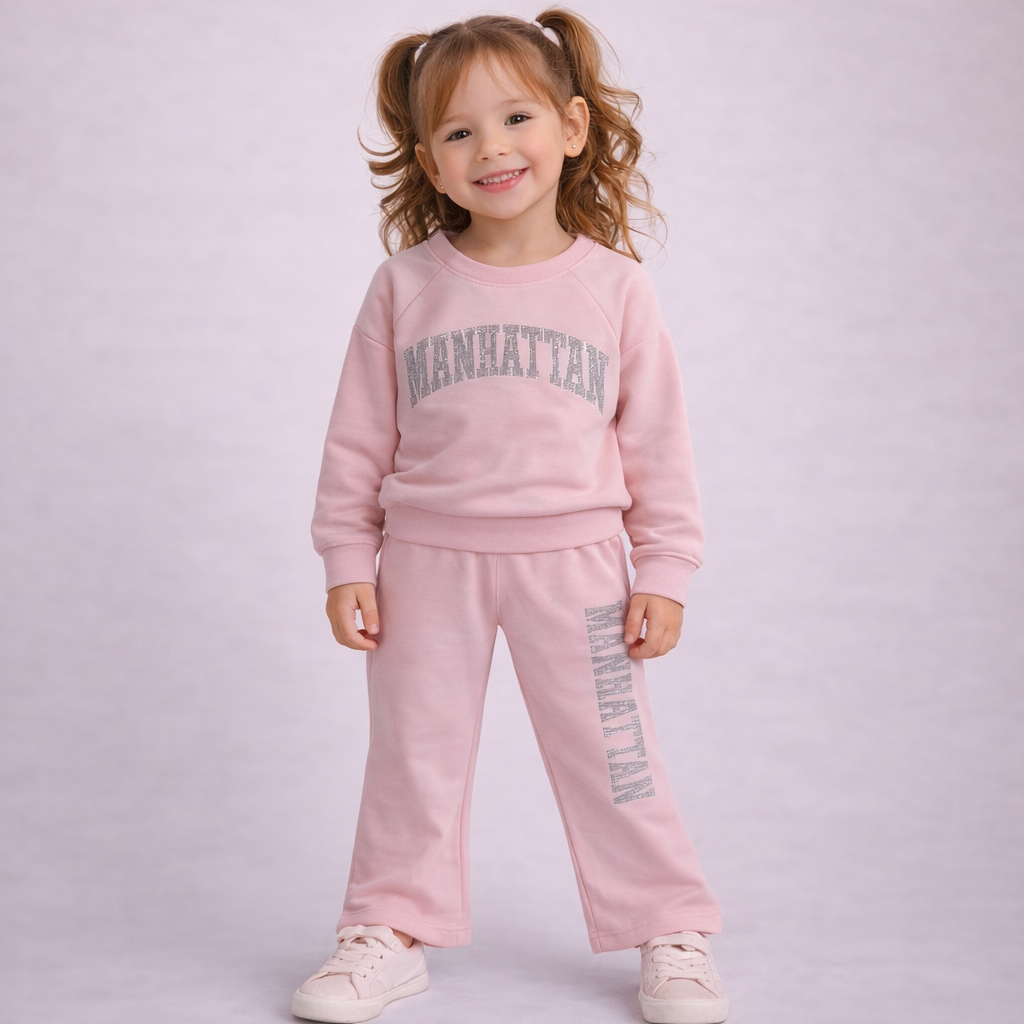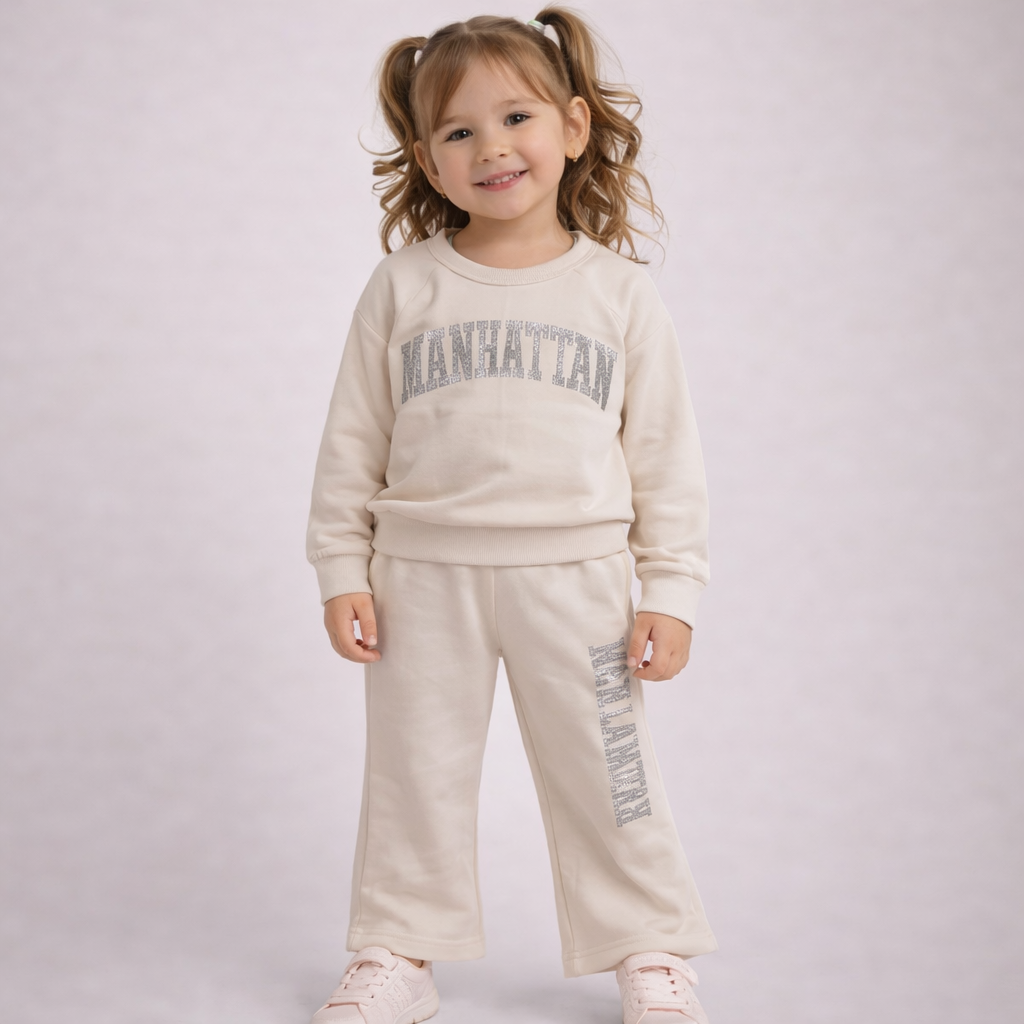 Composta da una felpa morbida e da un pantalone ampio con elastico in vita, questa tuta è perfetta per accompagnare le piccole in ogni momento della giornata — dal gioco al relax.