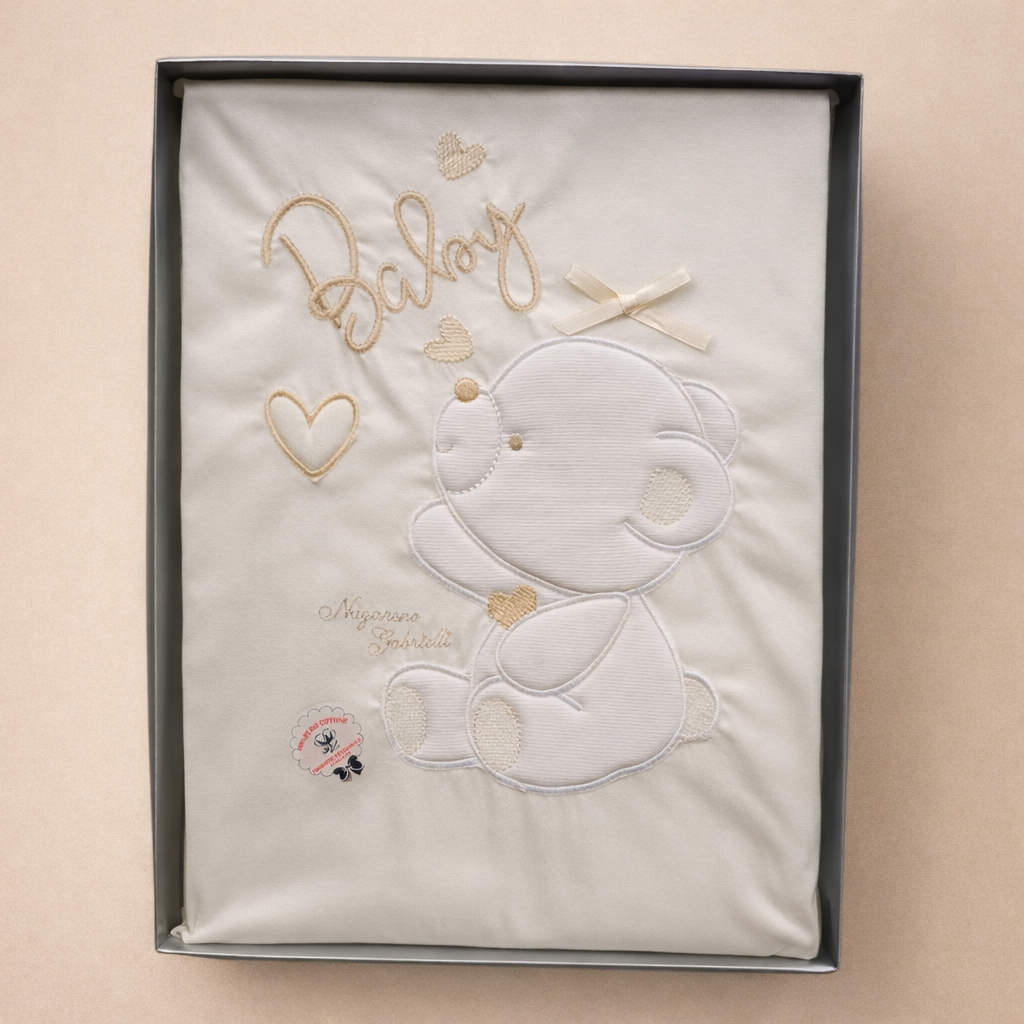 La dolce stampa con orsetto aggiunge un tocco tenero e raffinato, rendendo questa copertina perfetta per accompagnare i momenti più speciali: dalla nanna alle coccole, fino alle uscite quotidiane. Con una dimensione di 75×95 cm, è ideale per culla, carrozzina e passeggino, offrendo versatilità e praticità in ogni situazione.