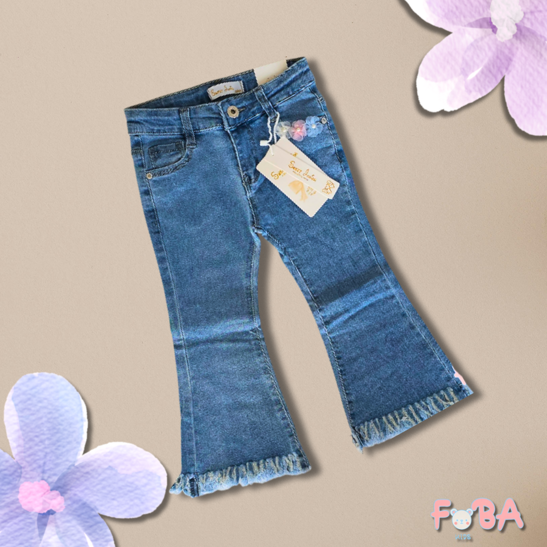 La caratteristica silhouette a zampa dona un tocco di originalità e raffinatezza, rendendoli perfetti per outfit casual, chic o più ricercati. Il design è impreziosito da tre delicati fiori posizionati vicino alla tasca, un dettaglio femminile e giocoso che rende questi jeans davvero speciali.