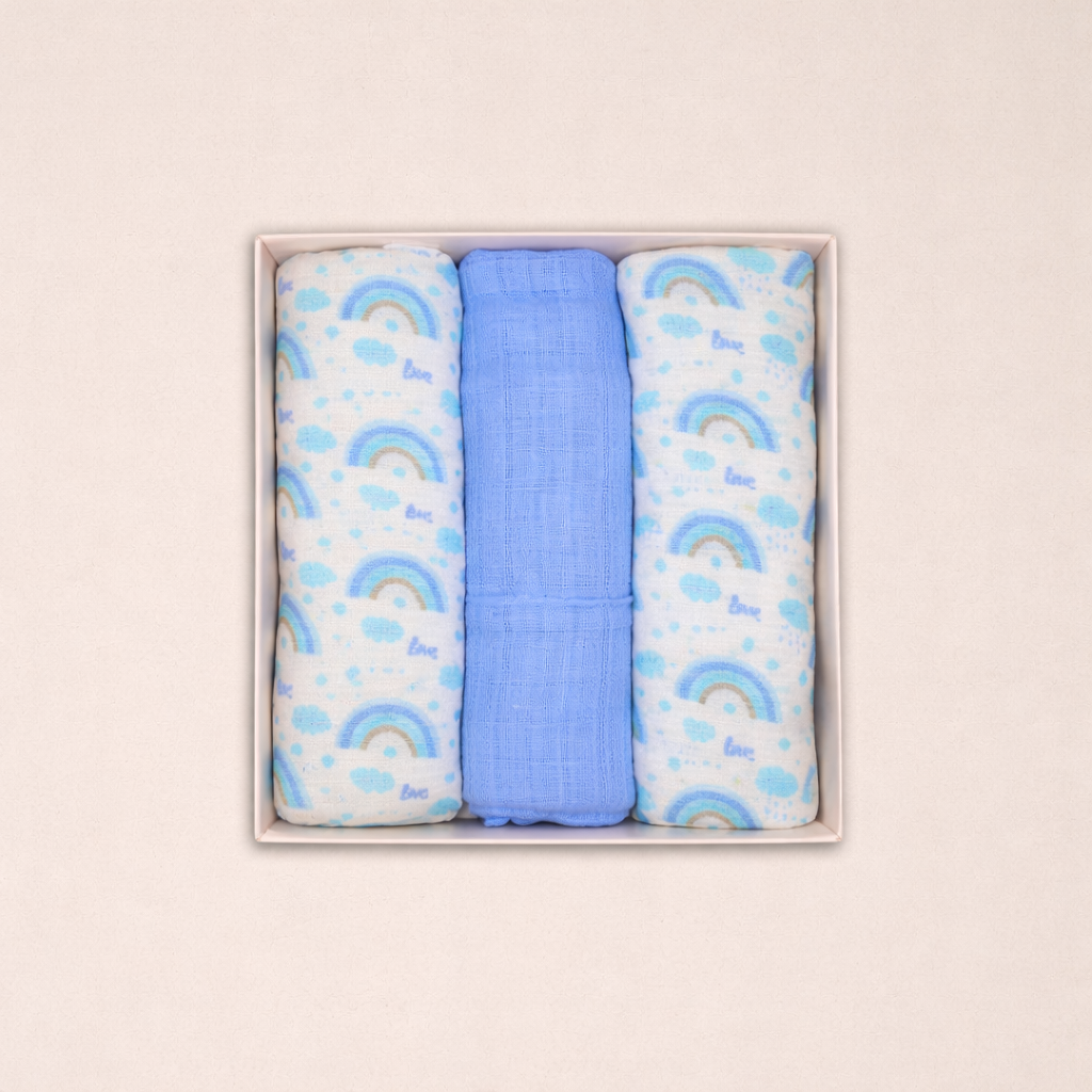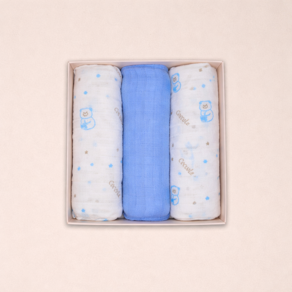 Il set comprende tre mussole in colorazioni dolci e armoniose – rosa, cielo e neutro – perfette per adattarsi a ogni corredino. Leggere, facili da lavare e sempre utili: un must-have per ogni mamma e papà che cercano qualità e comodità in un unico prodotto.