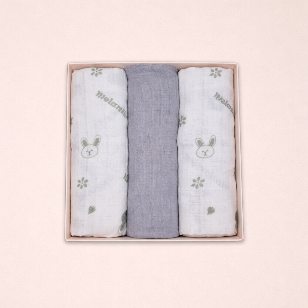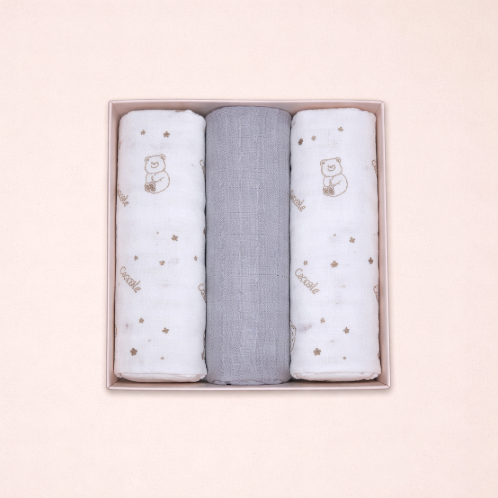 Il set comprende tre mussole in colorazioni dolci e armoniose – rosa, cielo e neutro – perfette per adattarsi a ogni corredino. Leggere, facili da lavare e sempre utili: un must-have per ogni mamma e papà che cercano qualità e comodità in un unico prodotto.