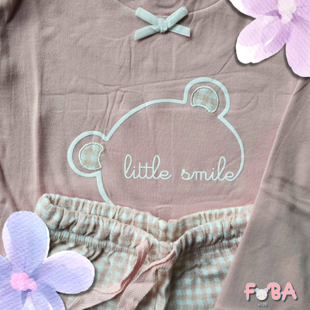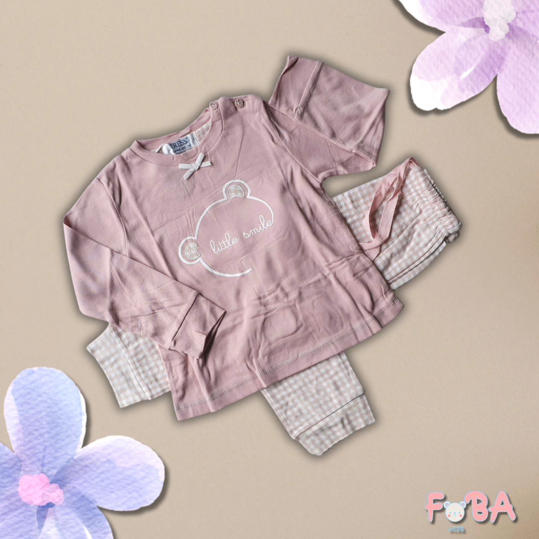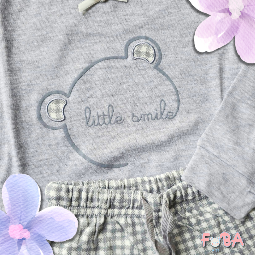 I pantaloni a quadretti sono dotati di un pratico laccio regolabile in vita, che garantisce una vestibilità confortevole e libertà di movimento durante il sonno. La maglietta è impreziosita da una tenera stampa con la scritta “little smile”, che aggiunge un tocco allegro e giocoso al look.