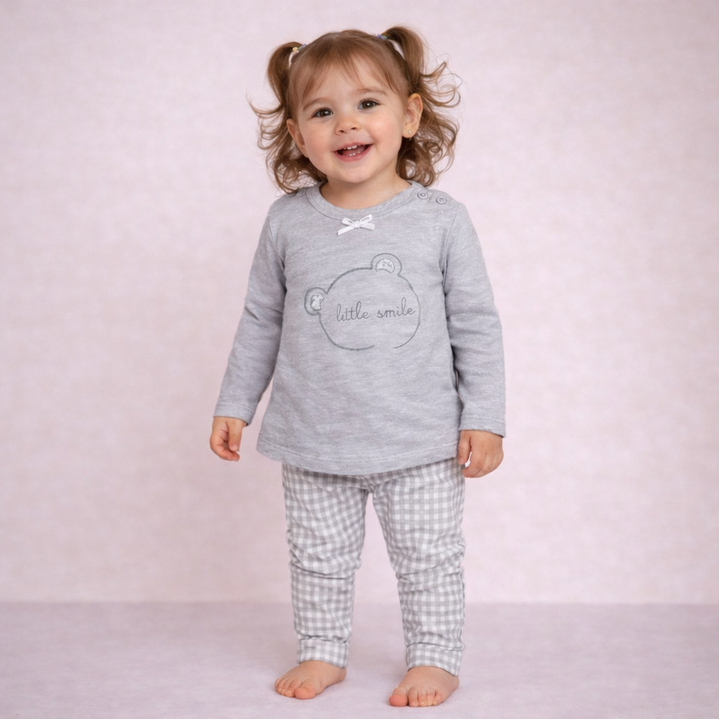 Scopri il comfort e lo stile del nostro pigiama da bimba, realizzato in 100% cotone di alta qualità, pensato per accompagnare le notti con dolcezza e comodità. La delicata combinazione di grigio e rosa lo rende raffinato e perfetto per ogni stagione.