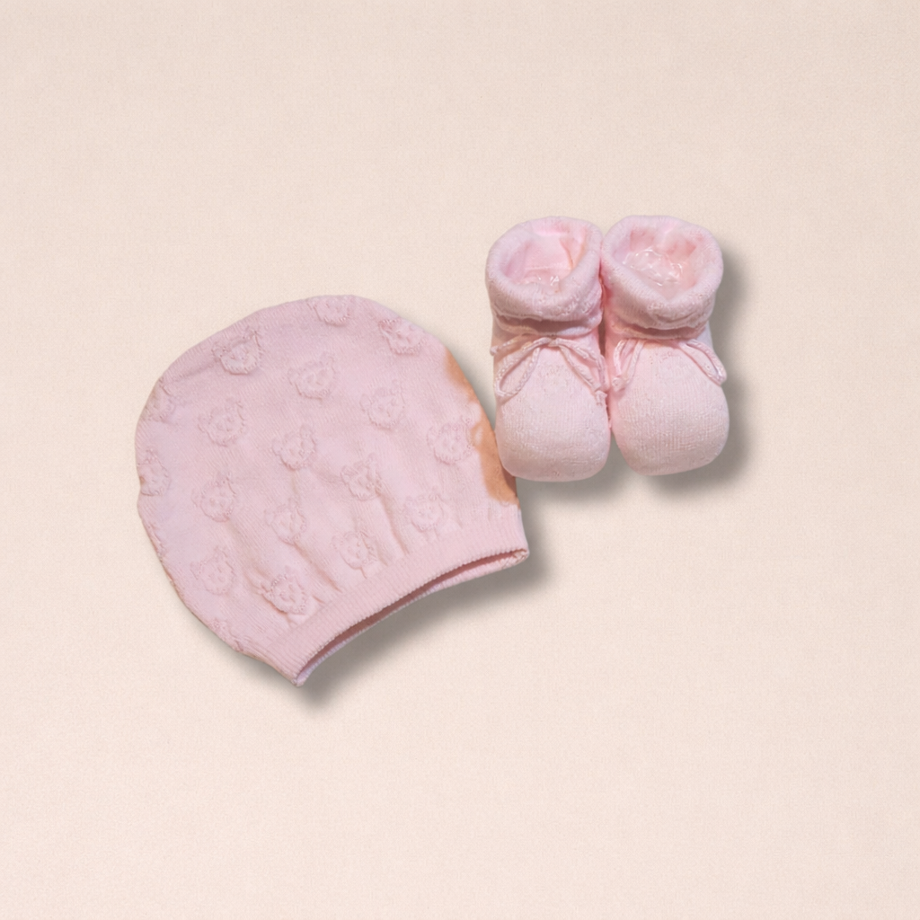 Composto da cappellino e scarpine, è realizzato in 100% cotone morbido e caldo, perfetto per la pelle delicata del neonato.