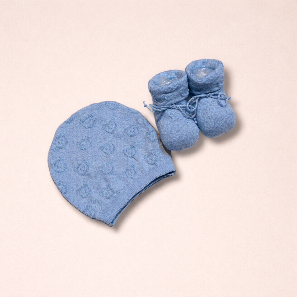 Set neonato in 100% cotone composto da cappellino e scarpine. Morbido, caldo e traspirante, ideale per proteggere i più piccoli nei mesi freschi.