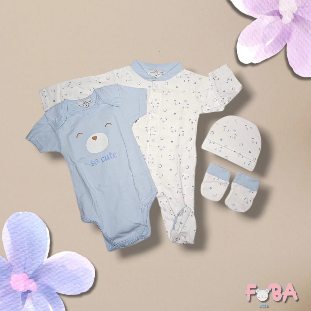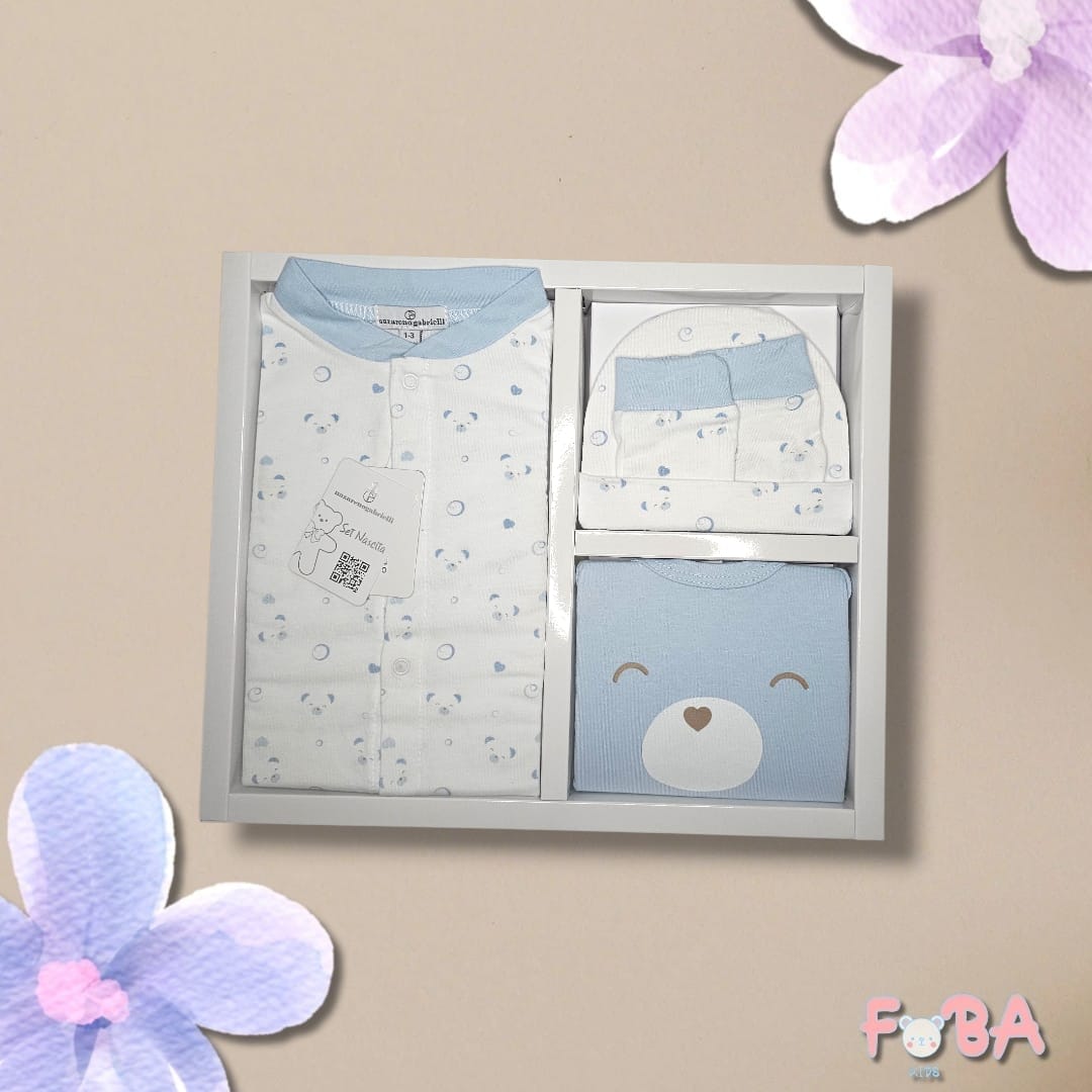 Questo meraviglioso set nascita 4 pezzi in tonalità azzurra è perfetto per i primi mesi del neonato e rappresenta un’idea regalo elegante e sempre apprezzata.