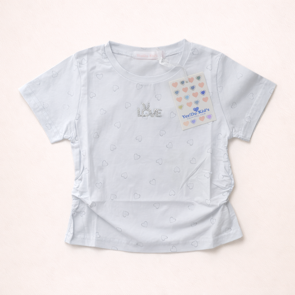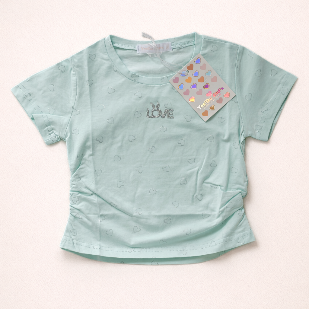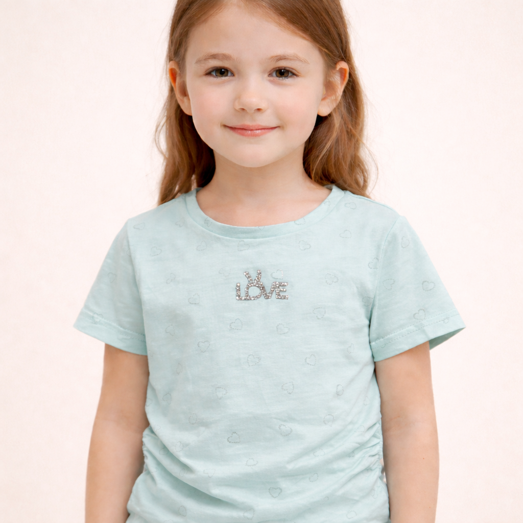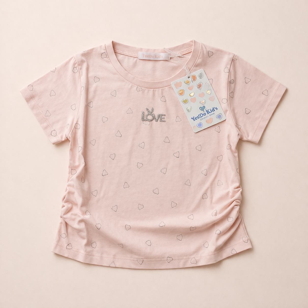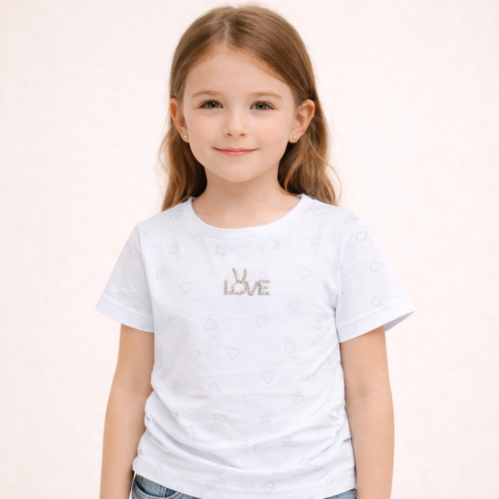 Scopri la nostra incantevole T-shirt a manica corta, decorata con adorabili cuoricini glitterati che aggiungono un tocco di brillantezza e stile al tuo look quotidiano. Realizzata con una composizione di 95% cotone e 5% elastan, questa maglietta offre un comfort eccezionale e una vestibilità che si adatta perfettamente al corpo, garantendo libertà di movimento in ogni occasione. Perfetta da abbinare a jeans, gonne o pantaloni, è un must-have nel guardaroba di ogni fashionista. Indossa la tua personalità con questa T-shirt unica e scintillante!