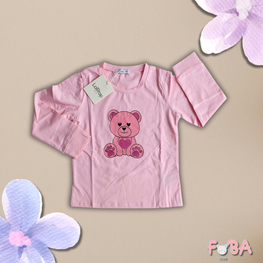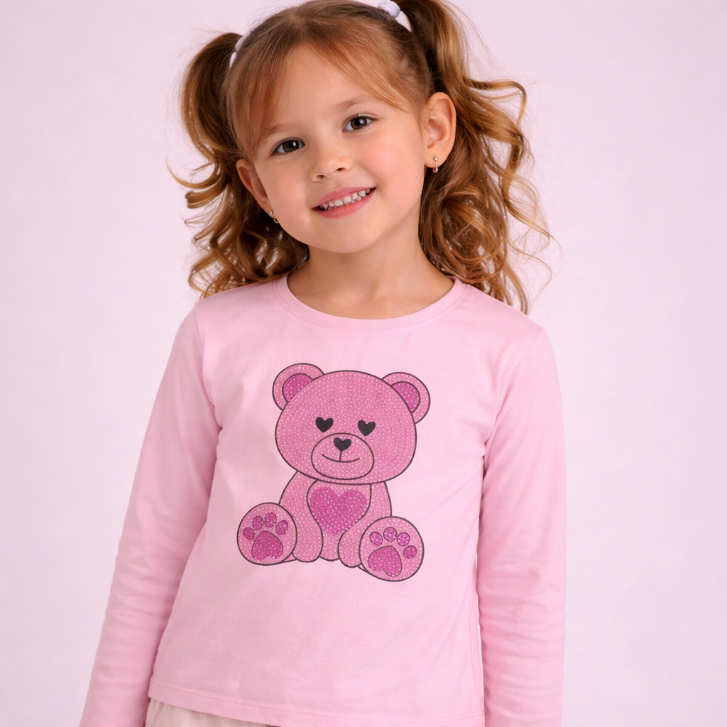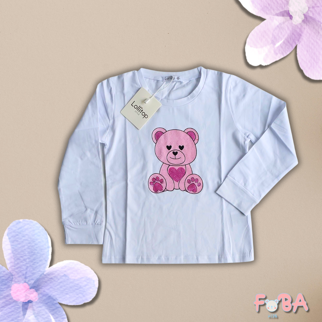 T-shirt manica lunga con stampa orsetto e strass