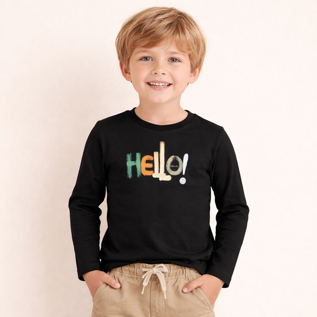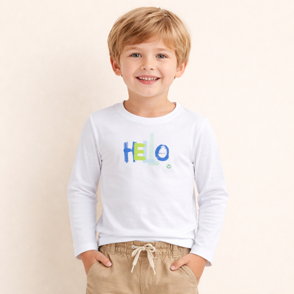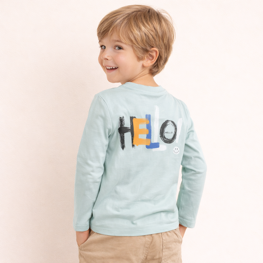 Scopri la T-shirt manica lunga per bambino con la simpatica stampa “hello” sul corpetto e sul retro, perfetta per la primavera e le giornate di mezza stagione.