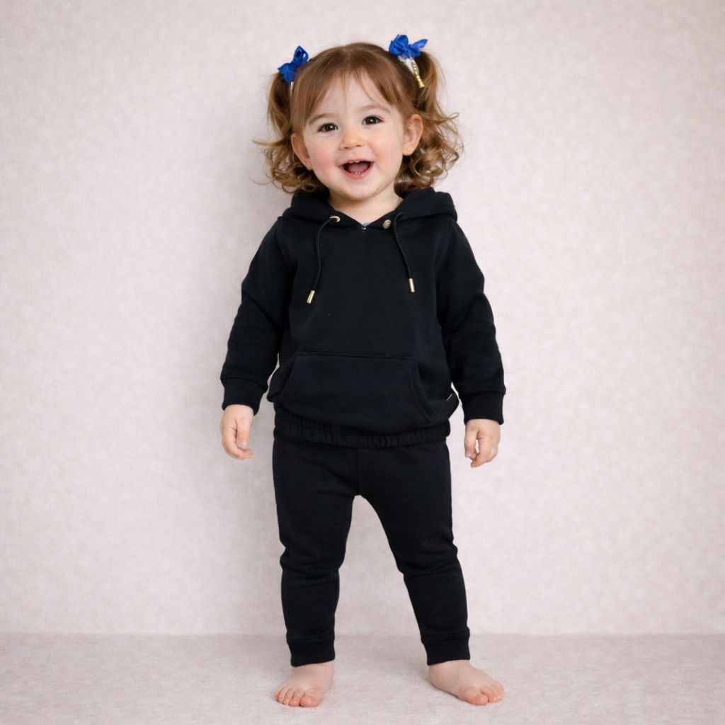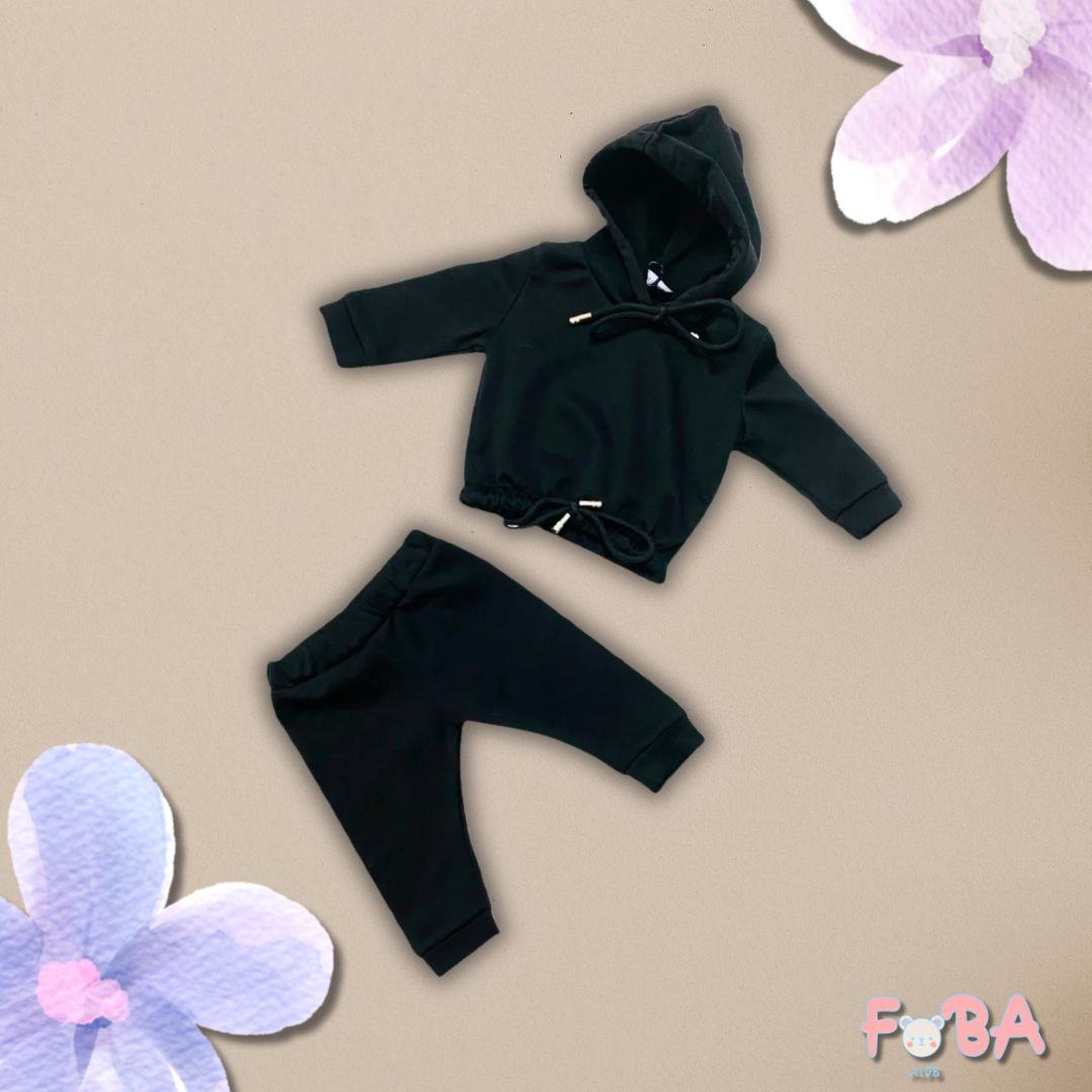 Il set è composto da una felpa a maniche lunghe con cappuccio e da un pantalone morbido con elastico in vita, entrambi in tessuto felpato caldo e confortevole.