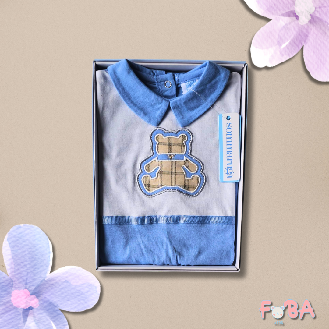 Il ricamo di un tenero orsetto sul corpetto aggiunge un tocco di dolcezza e raffinatezza, rendendo questa tutina perfetta sia per la quotidianità che per le occasioni speciali.