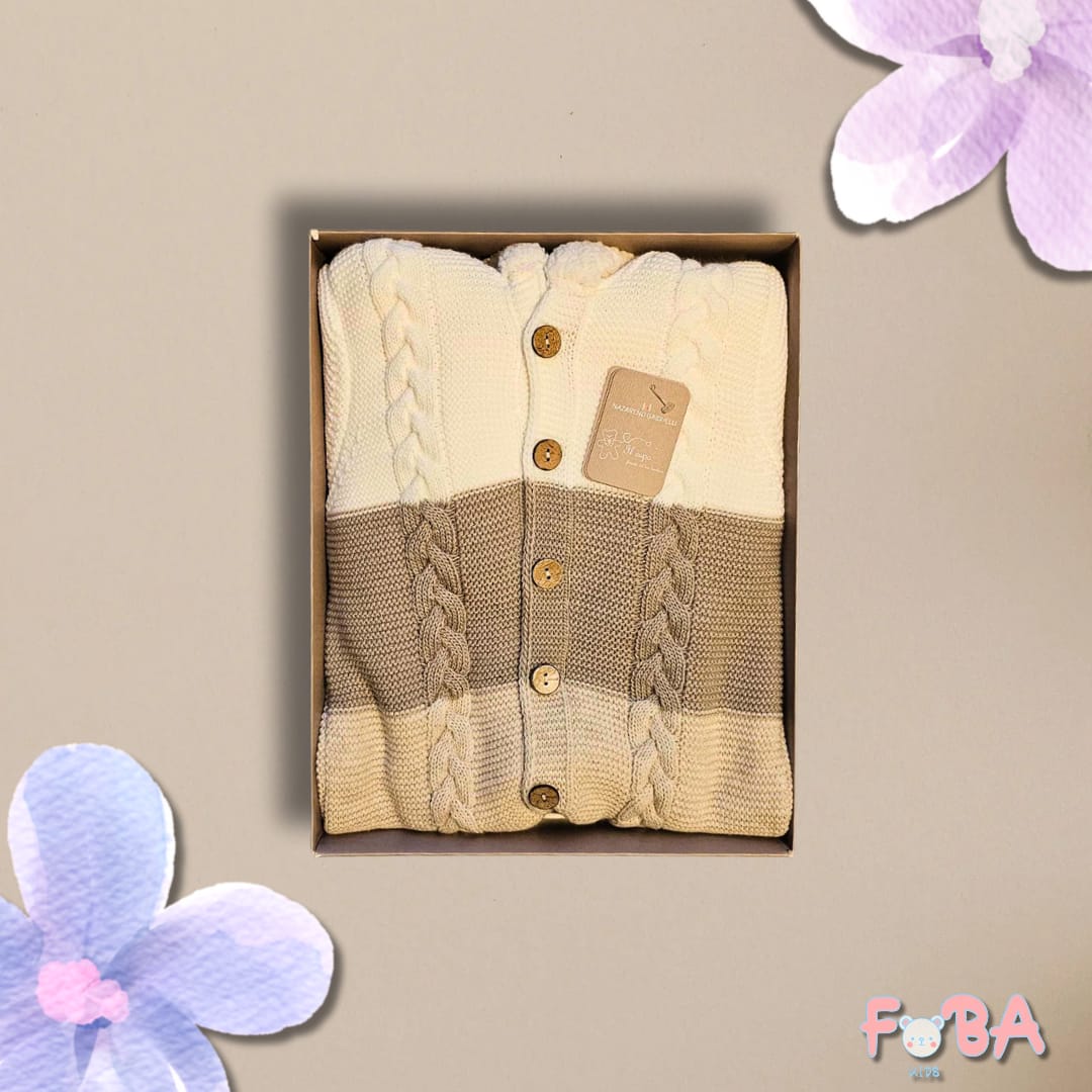 Realizzato in filato morbido e traspirante (cotone/acrilico), presenta una lavorazione a tre fasce di colore nei toni del crema e del beige, arricchita da delicate trecce decorative sul davanti.