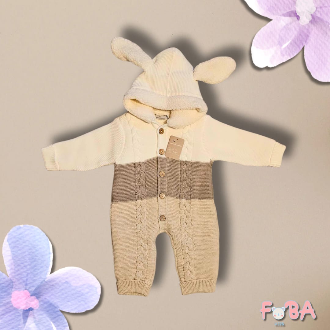 Mantieni il tuo piccolo al caldo con stile grazie a questo tutone in maglia con cappuccio a coniglietto.